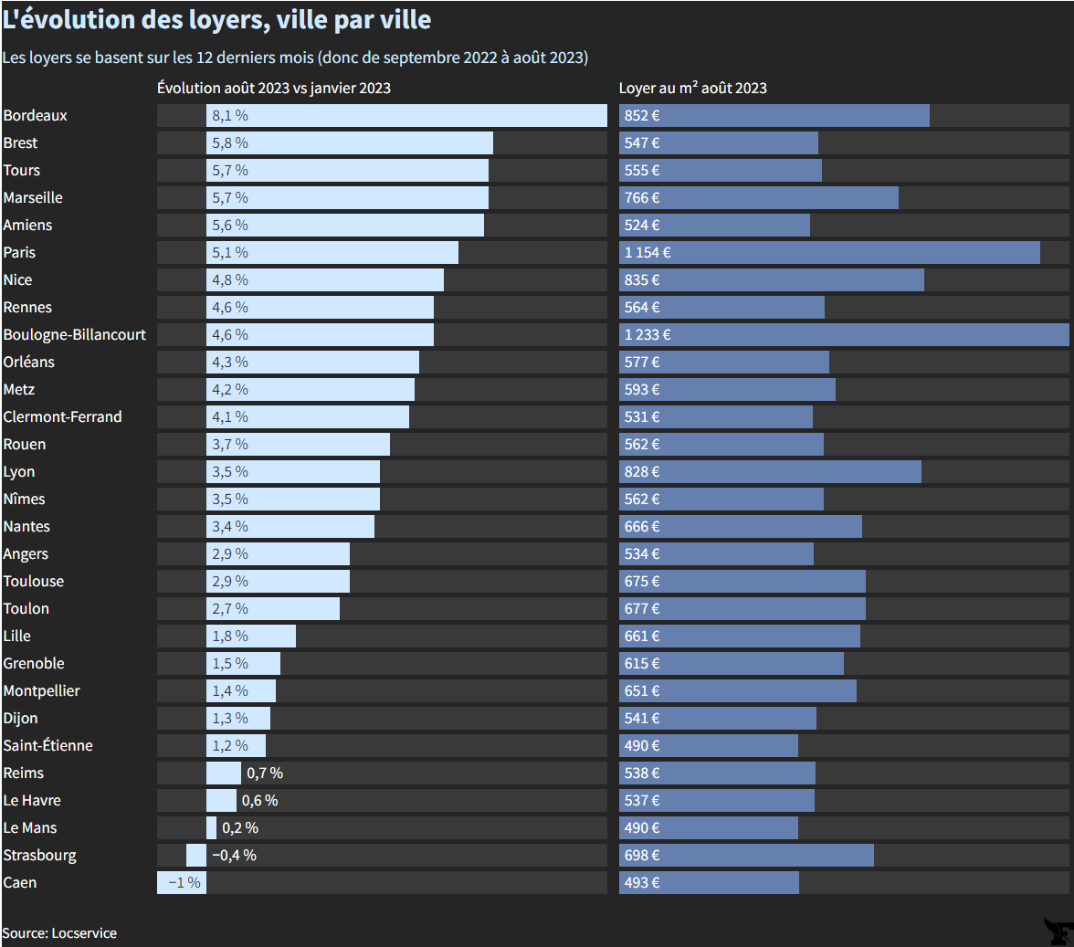 En parallèle, l’offre se fait plus rare : avec l’interdiction de louer des logements énergivores (classés F ou G sur le Diagnostic de performance énergétique), de plus en plus de propriétaires préfèrent vendre leur passoire thermique que de réaliser les travaux nécessaires pour pouvoir continuer de la louer. Il n’en fallait pas plus pour accroître la tension locative. Et cela se ressent dans les chiffres. En moins d’un an, les loyers ont grimpé dans la totalité des villes. C’est à Bordeaux qu’ils ont le plus flambé (+8,1%). Pour la plupart des autres communes analysées, les hausses s’étalent entre +3% et +6%…
